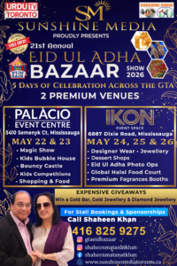 This year, the 21st Annual Eid ul-Adha Bazaar will take place over five days at two prestigious venues in Mississauga. This thoughtfully designed celebration will feature shopping, fashion, jewelry, family entertainment, food, children’s activities, and exclusive giveaways.